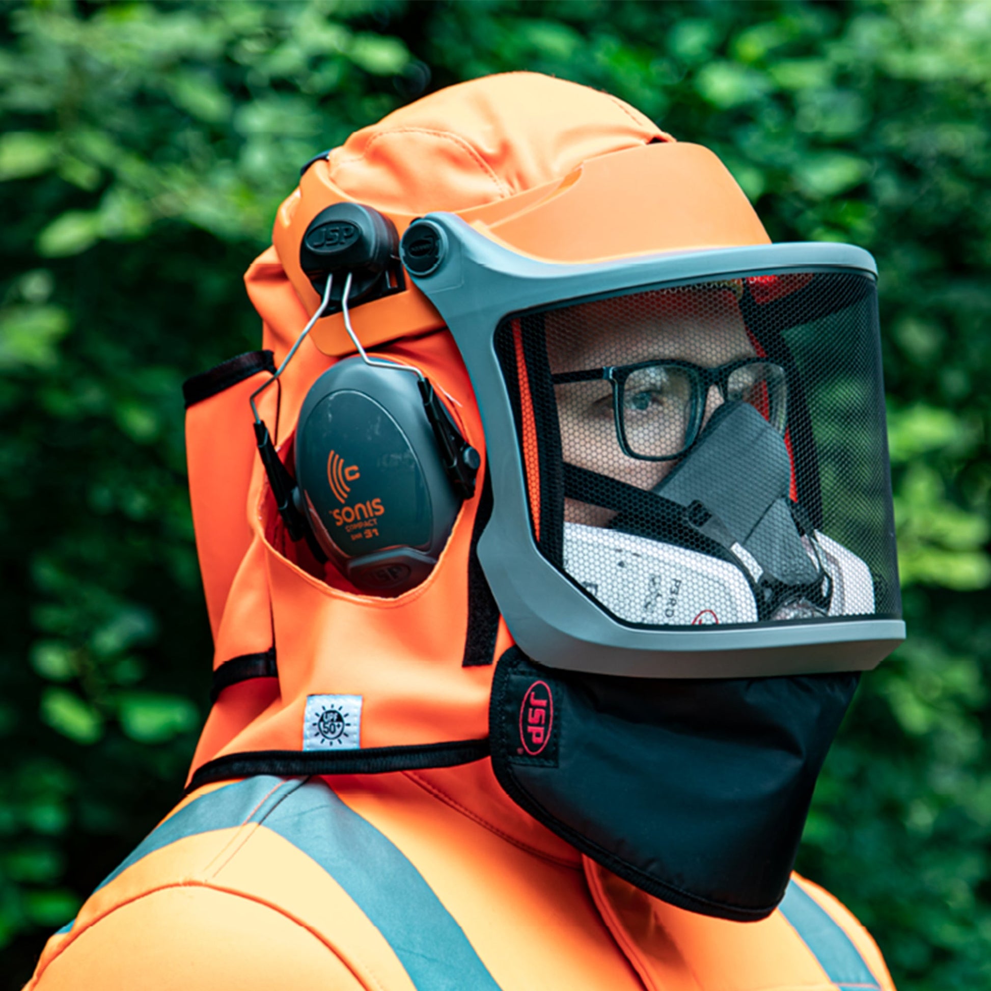 UV protective sun cape, in hi-vis forestry orange, for use with EVOGuard® browguards.Compatible with ear defenders and featuring a water-repellent coating, the EVOGuard® Browguard Sun Cape is ideal for landscaping, arborist activities, and other outdoor work.