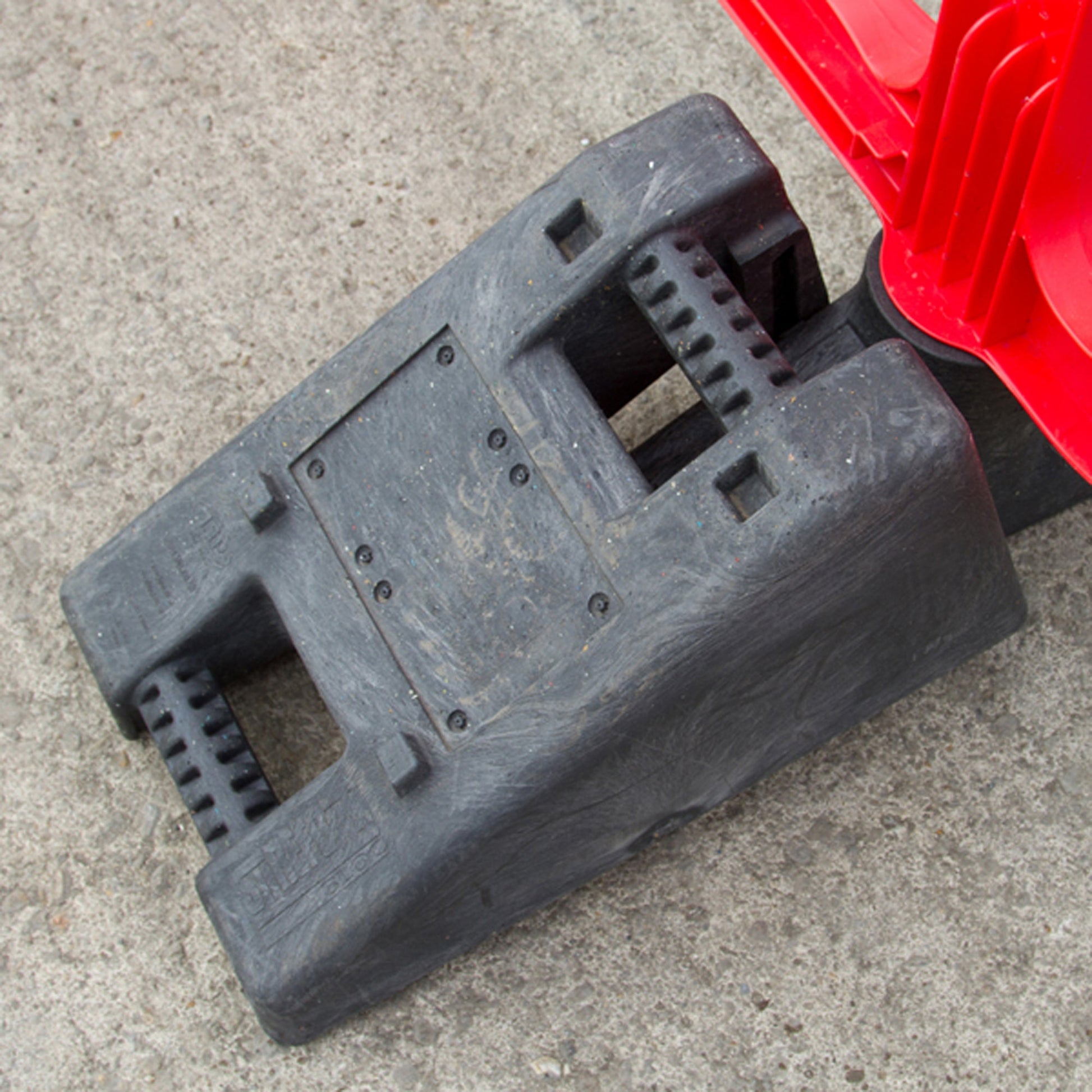 SureFoot Bloc™ can be put over SureFoot™ feet of a Frontier™ Cross-Link™ and Titan™ barriers to add extra weight more effectively than alternative methods such as using sandbags. They can also be used as a weighted anchor for the Frontier™ using one of it's carry handles to accept the telescopic stabilty poles and join it to the barrier.