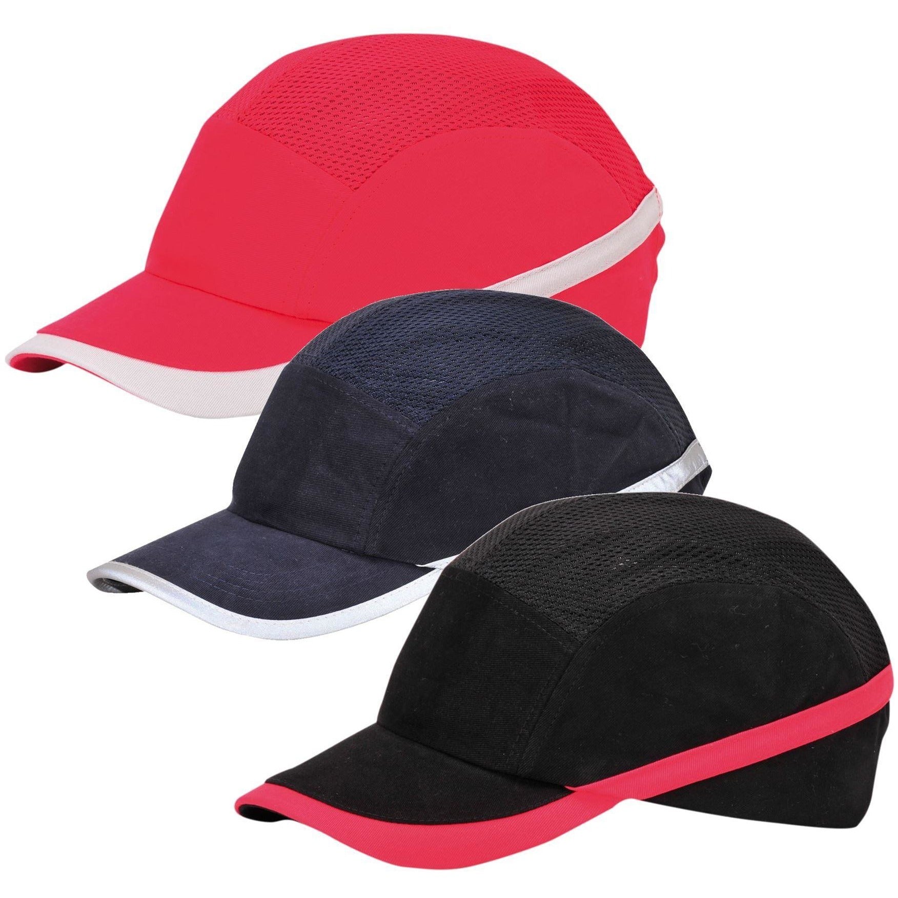 Sport look bump cap with large mesh panel on the top, allowing maximum airflow. Reflective stripes for enhanced visibility and style (on navy option only). Hook and loop adjustable size.